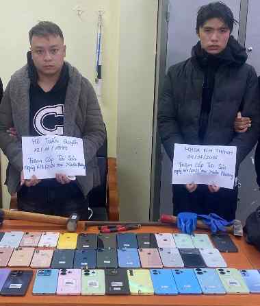 Công an TP Hà Nội ngày 10/1 cho biết, Công an phường Xuân Phương vừa bắt giữ Khoa Kim Thịnh (SN 2005, trú tại Hải An, Hải Phòng) và Hồ Tuấn Quyền (SN 1999, trú tại Hạ Bằng, Hà Nội) sau khi đột nhập lấy trộm 51 điện thoại trị giá gần 300 triệu đồng.
