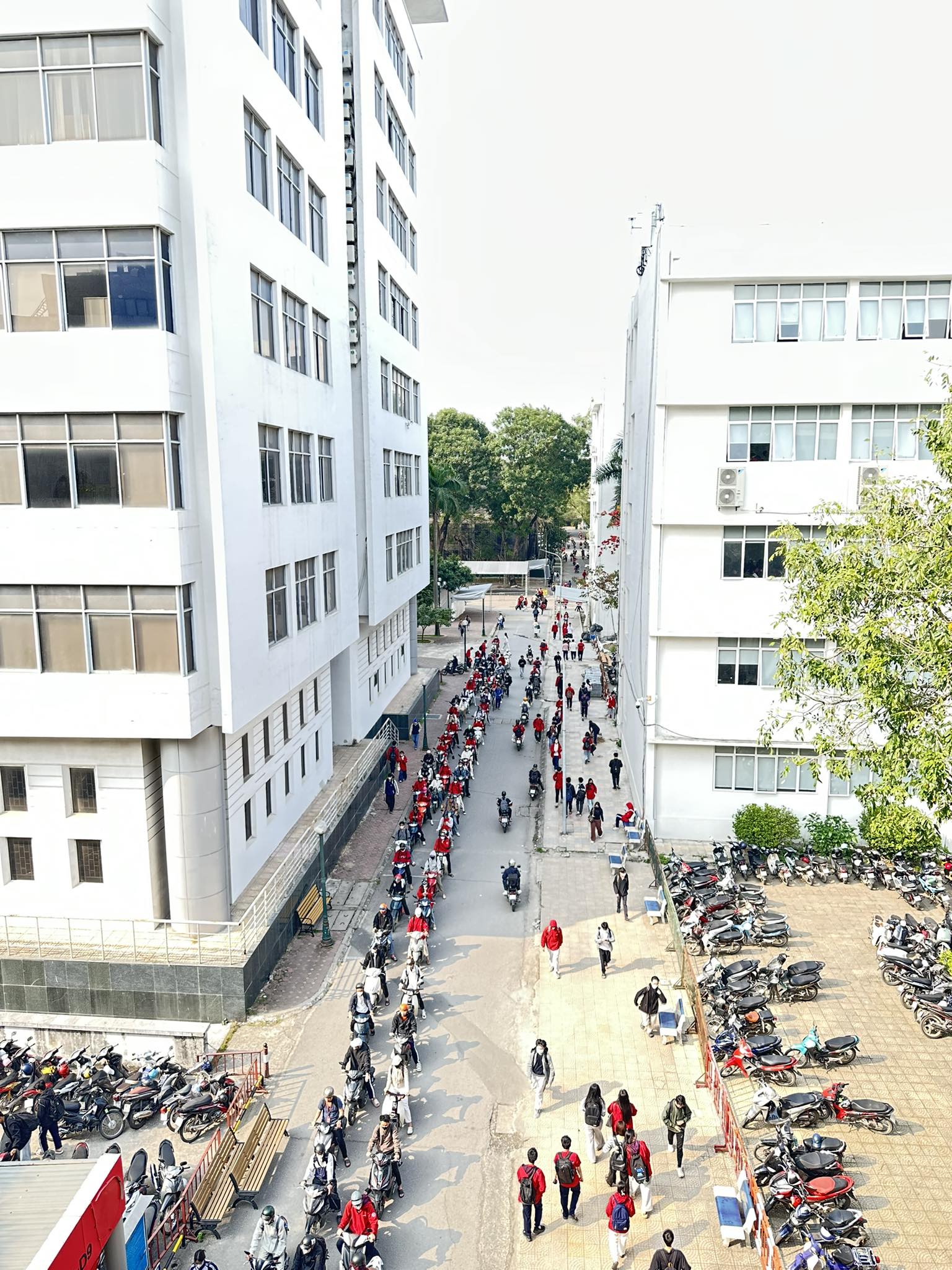 Hình ảnh được ghi lại từ trên cao cho thấy từng hàng xe máy kéo dài thành dòng gọn gàng giữa hai tòa nhà trong khuôn viên trường. Không khí khá trật tự, ai cũng kiên nhẫn chờ đến lượt mình. Chính sự ngay ngắn ấy khiến nhiều người xem phải thừa nhận rằng đôi khi, văn minh lại đến từ những hành động rất nhỏ.