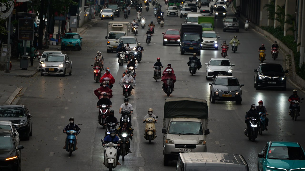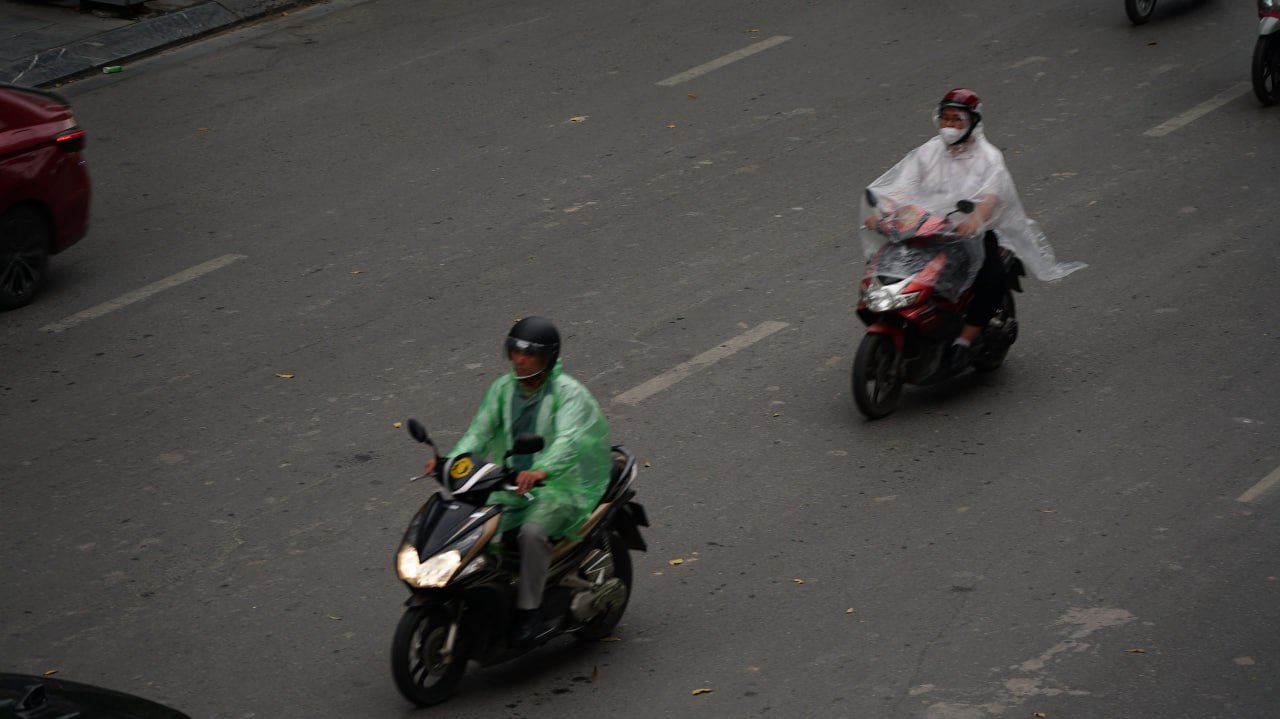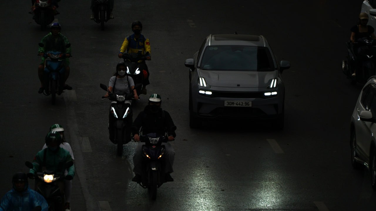 Dù đã qua giờ cao điểm buổi sáng, nhiều khu vực Hà Nội vẫn chìm trong ánh sáng lờ mờ như chạng vạng, kèm theo gió và mưa nhỏ.