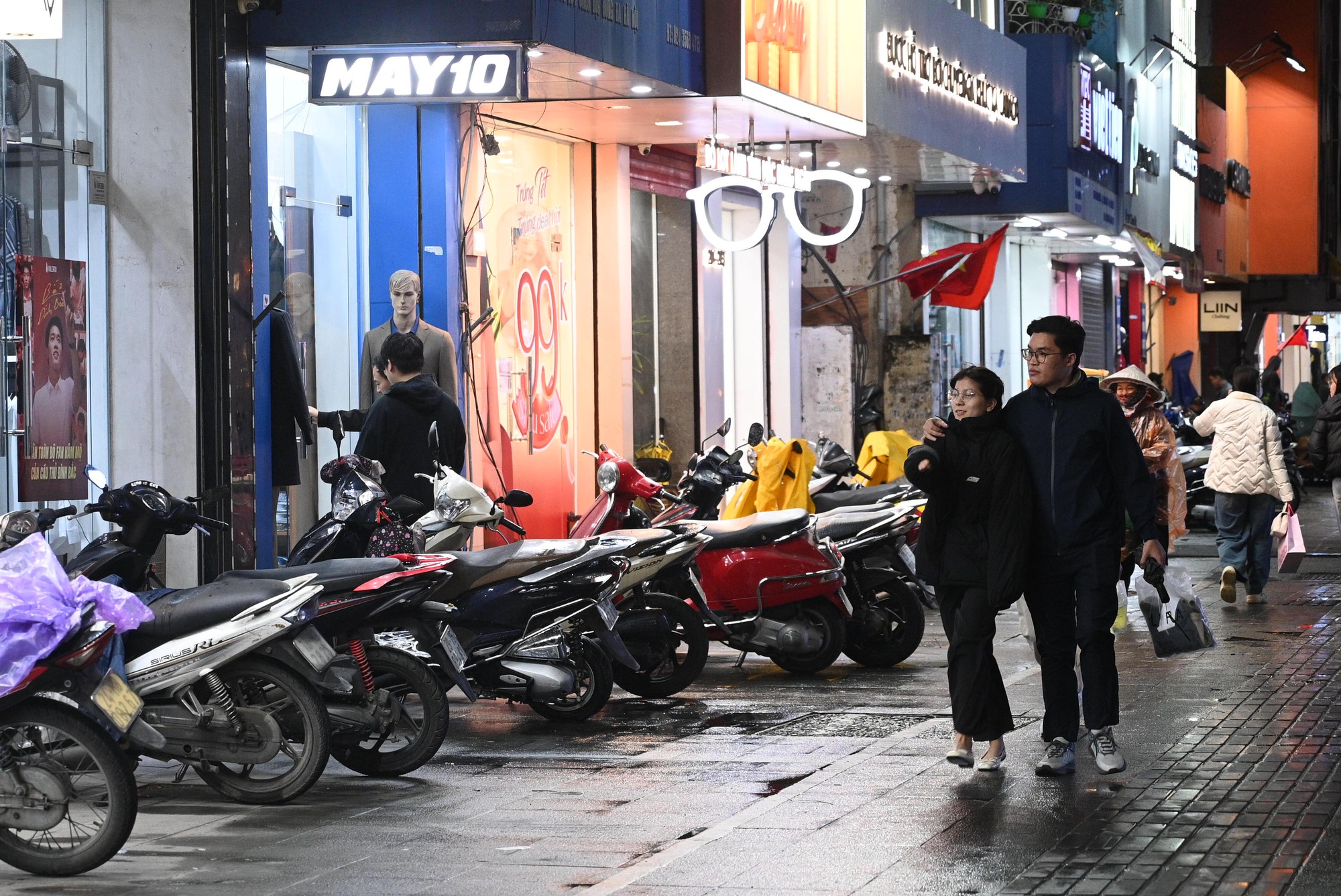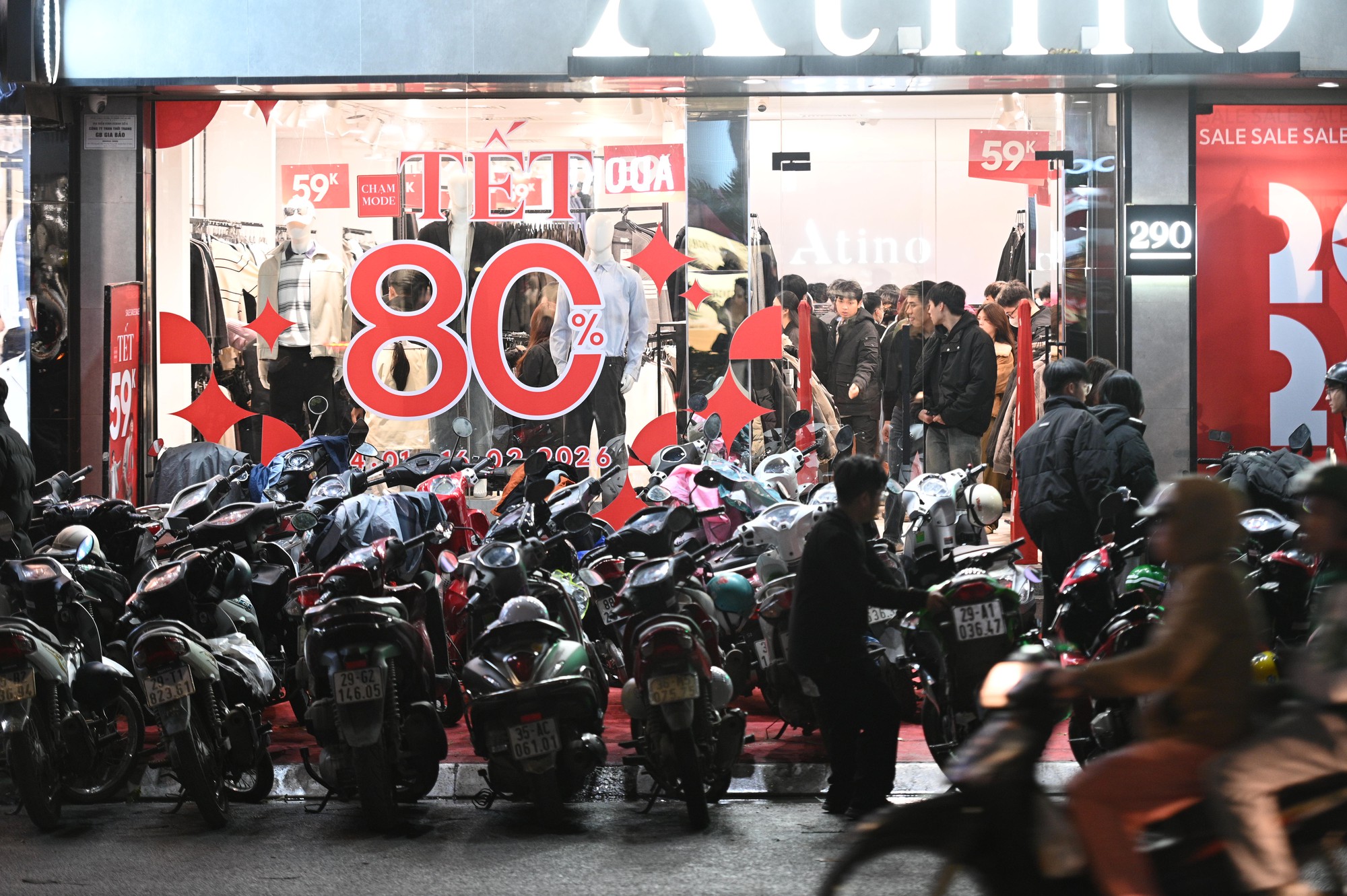 Từ đầu giờ tối, lượng phương tiện đổ dồn về các tuyến phố mua sắm khiến nhiều đoạn đường trở nên đông đúc. Trước một số cửa hàng thời trang lớn, xe máy của khách xếp kín vỉa hè, thậm chí tràn xuống lòng đường thành hai, ba hàng. Bên trong, khách chen chân chọn đồ, thử quần áo, thanh toán liên tục.