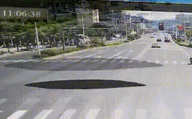 Theo hình ảnh được camera an ninh ghi lại, vào lúc 11h06', mặt đường nơi xảy ra vụ việc bỗng nhiên bị nứt toác, sau đó sụt xuống 1 mảng lớn, tạo thành chiếc hố tròn với đường kính khoảng 3m, sâu khoảng hơn 2m.