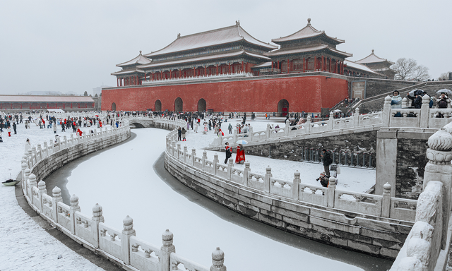 Trong số các địa điểm được du khách săn đón nhiều nhất mỗi khi tuyết rơi, Tử Cấm Thành (Cố Cung) luôn đứng đầu danh sách. Mái ngói lưu ly vàng phủ tuyết trắng tạo nên khung cảnh tương phản ấn tượng, được ví như "bước ra từ phim cổ trang". Không ít du khách chia sẻ rằng chỉ cần một trận tuyết nhẹ, Cố Cung đã trở thành điểm check-in "đáng giá nhất mùa đông".