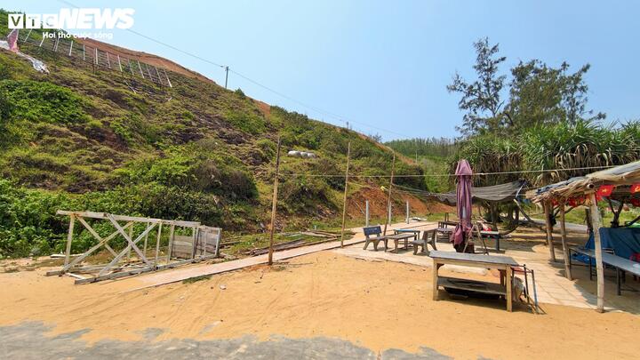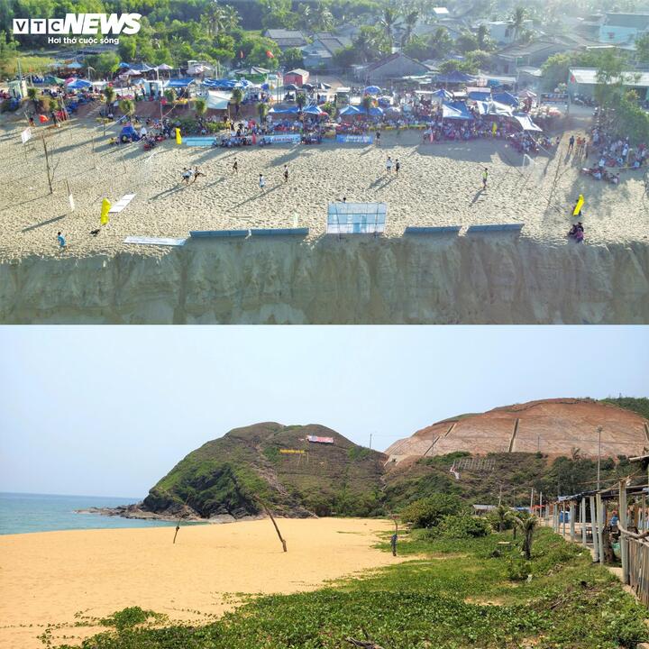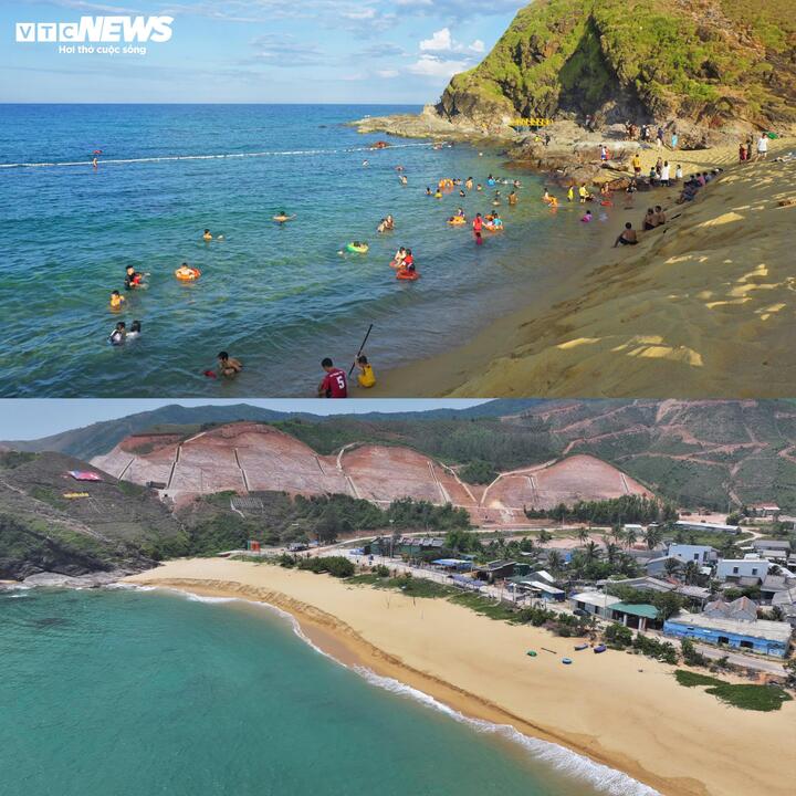 Bãi tắm đẹp có chiều dài khoảng 500 m, nơi từng được người dân địa phương và du khách yêu thích nhất giờ chỉ là bãi cát dài, vắng bóng du khách. (Ảnh trước và sau)