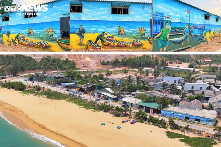Con đường bê tông ra Mũi Gành lung linh hình ảnh tranh bích họa trước đó cũng bị bạc phếch, không còn nguyên vẹn. (Ảnh trước và sau)