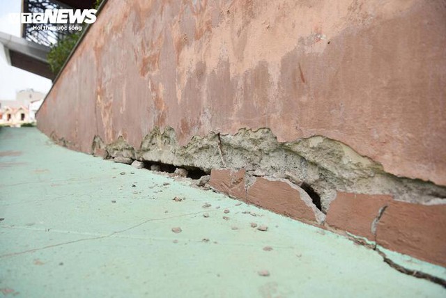 Nhiều mảng tường bong tróc, loang lổ hở cả sắt thép bên trong.