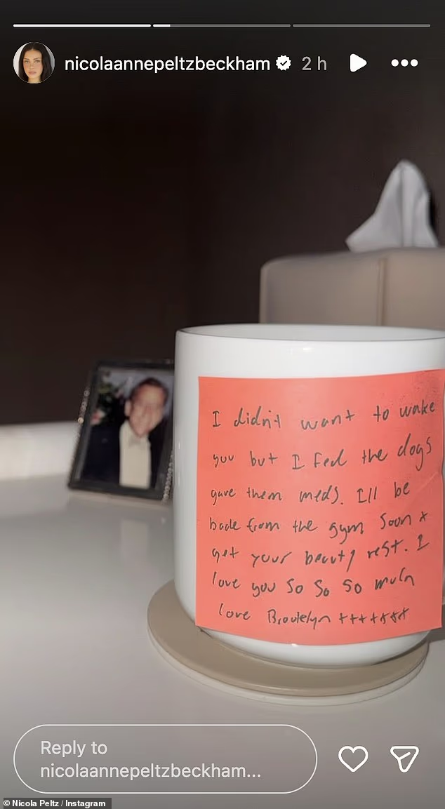 Lời nhắn đầy tình cảm có đoạn: anh không muốn đánh thức vợ, đã cho chó ăn và uống thuốc, vừa đi tập gym về và mong cô nghỉ ngơi thêm. Cuối tin nhắn là loạt lời yêu thương kéo dài, đủ để thấy mức độ chiều chuộng mà Brooklyn dành cho nửa kia.