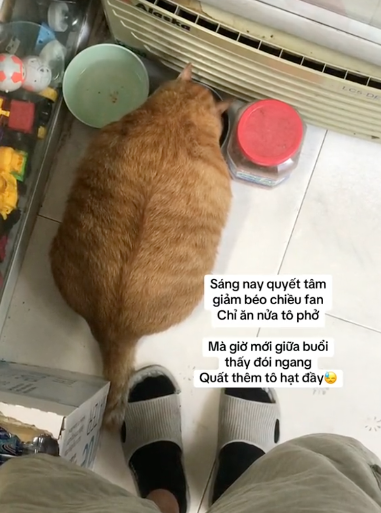 Hàng ngày "cậu cả" được chủ cho ăn hạt, pate... không biết được ăn mấy cữ mà sở hữu thân hình có phần "khiêm tốn chiều dài, tự hào chiều rộng". Có người nói "cậu cả" nhìn như múi mít khổng lồ, có người lại ví von cậu như nuốt trái dưa hấu, nuốt bình ga, cái lu di động...