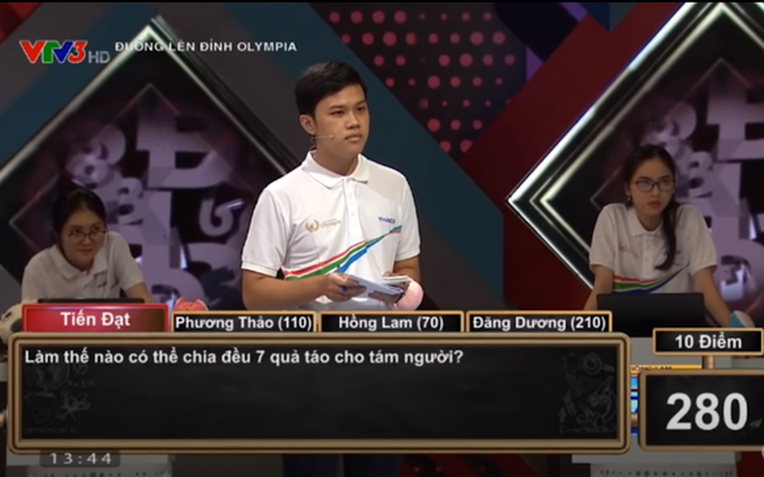 Cụ thể, trong vòng tuần cuối cùng năm 2020 , ở phần Về đích của nam sinh Tiến Đạt (THPT chuyên Tiền Giang) , MC Diệp Chi đưa ra câu hỏi 10 điểm: " Làm thế nào để có thể chia đều 7 quả táo cho 8 người?".