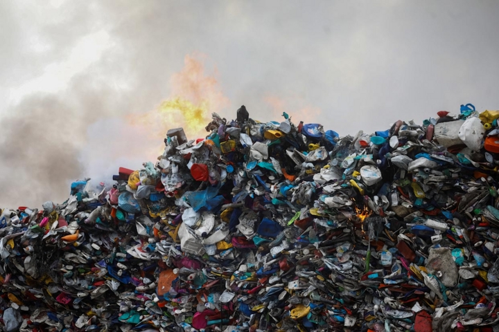 Dưới lớp khói mù mịt là tiếng kêu cứu của Trái Đất — mỗi mảnh nhựa cháy là một vết thương môi trường. (Nguồn: Reuters)