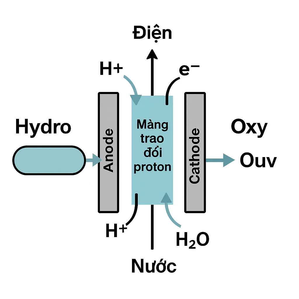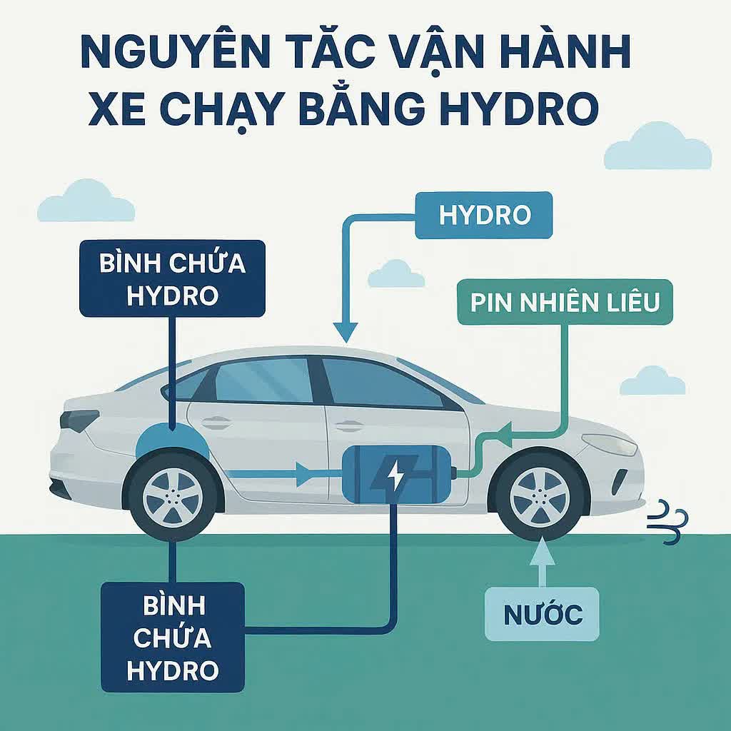 Khác với xe xăng hay xe điện cắm sạc, xe hydro sử dụng pin nhiên liệu (fuel cell). Hydro được nạp vào bình chứa trên xe. Khi vận hành, hydro phản ứng với oxy trong pin nhiên liệu, tạo ra: