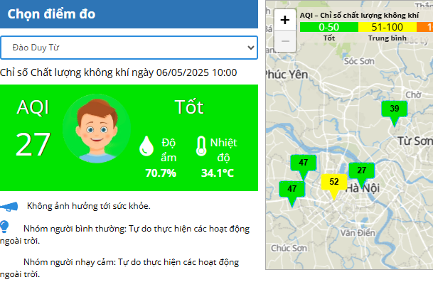 Tương tự, số liệu trên trang cem.gov.vn của Bộ Nông nghiệp và Môi trường đăng cùng thời gian có 2 khu vực chất lượng không khí ở ngưỡng trung bình là: số 556 Nguyễn Văn Cừ, chỉ số AQI là 76, công viên Thanh Xuân là 56 và khu vực Đại học Bách khoa Hà Nội ở ngưỡng tốt, chỉ số AQI là 50.