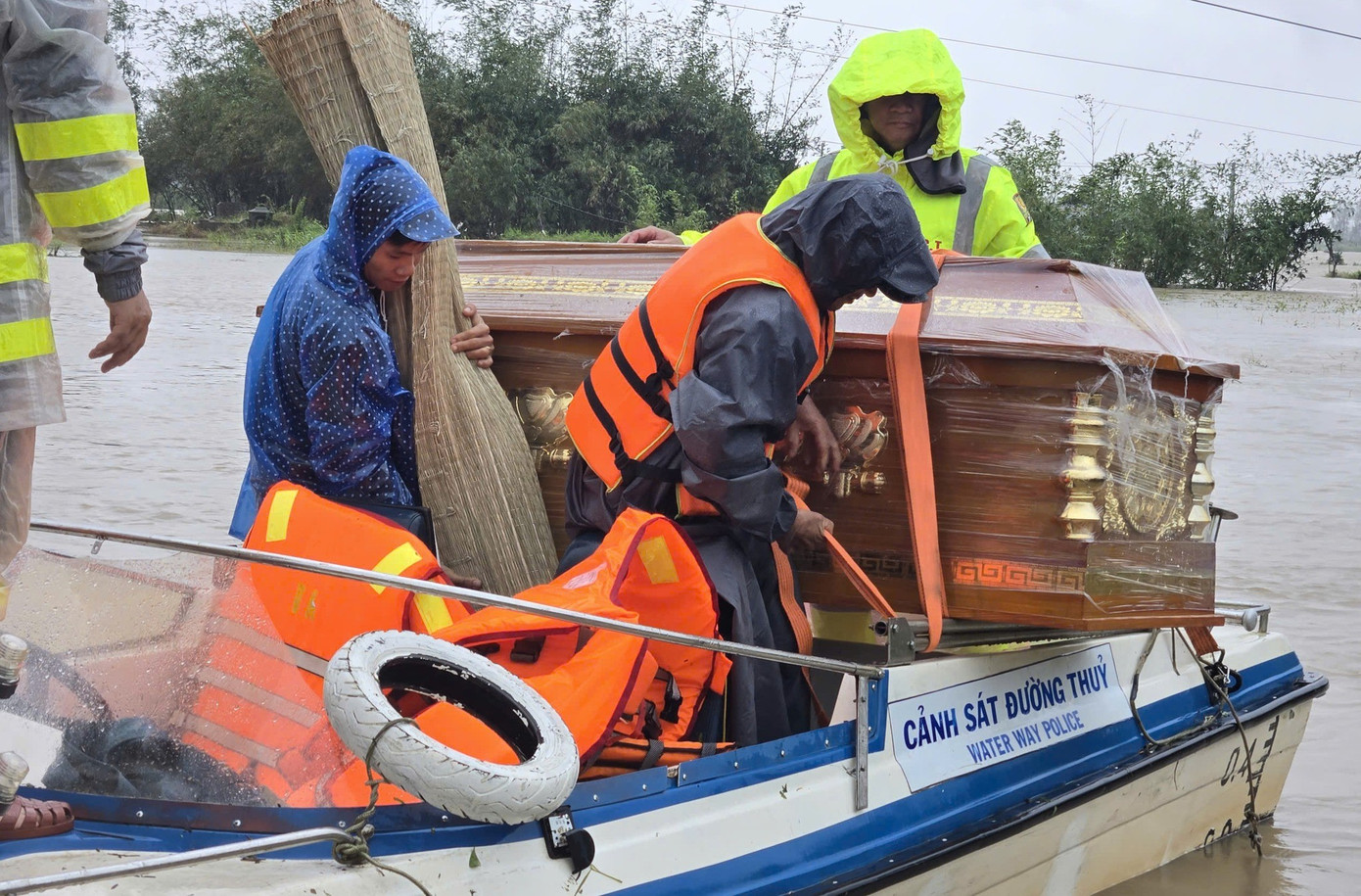 Cảnh sát đường thủy Đắk Lắk vượt lũ chở quan tài vào giúp người dân lo hậu sự.