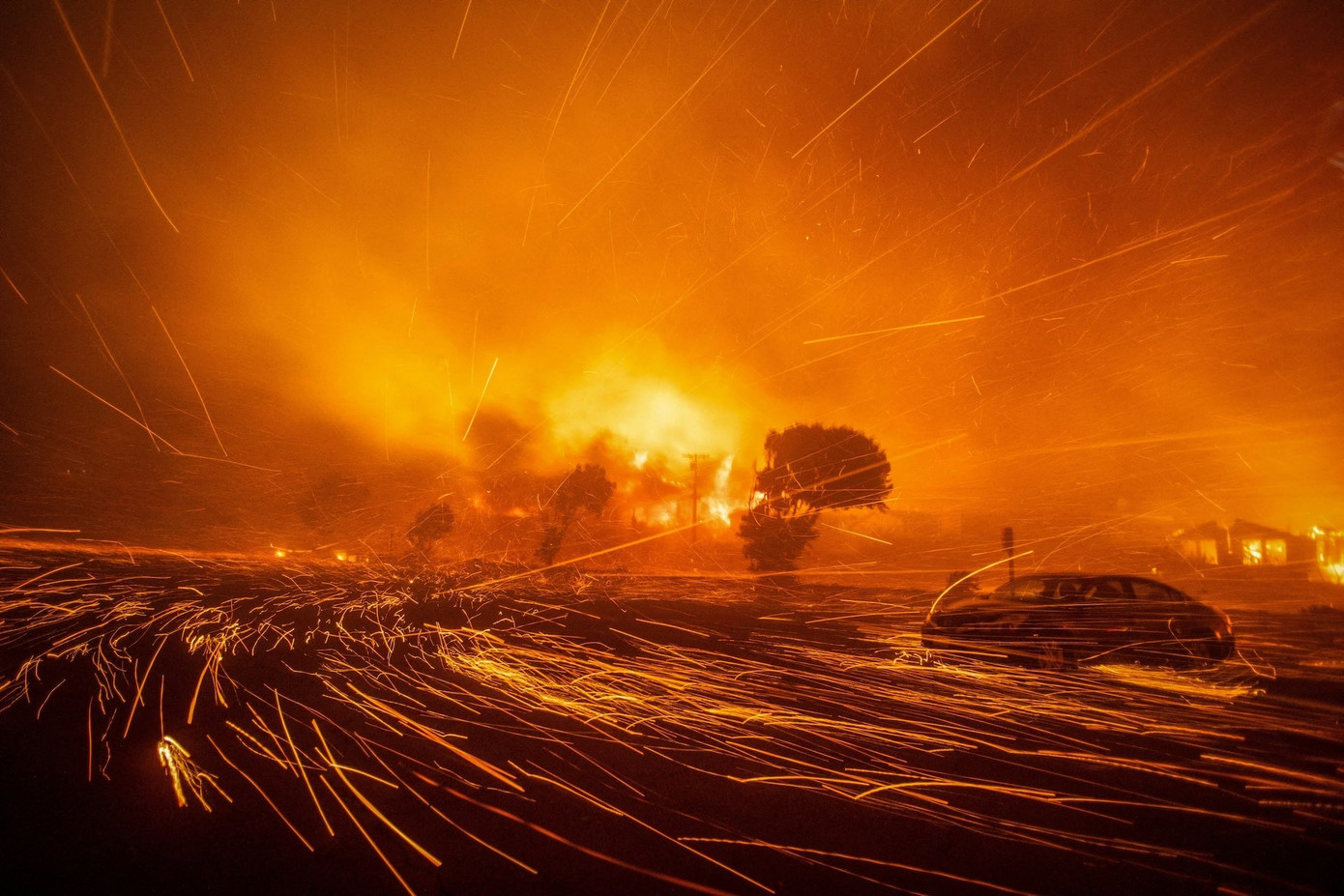 Gió thổi bay tàn lửa trong trận cháy rừng Palisades ở phía Tây Los Angeles (California, Mỹ) ngày 7/1. Các đám cháy ở Los Angeles đã phá hủy khoảng 16.000 ngôi nhà, trong đó các khu vực Altadena, Malibu, Topanga và Pacific Palisades bị ảnh hưởng nặng nề nhất. (Ảnh: Reuters)