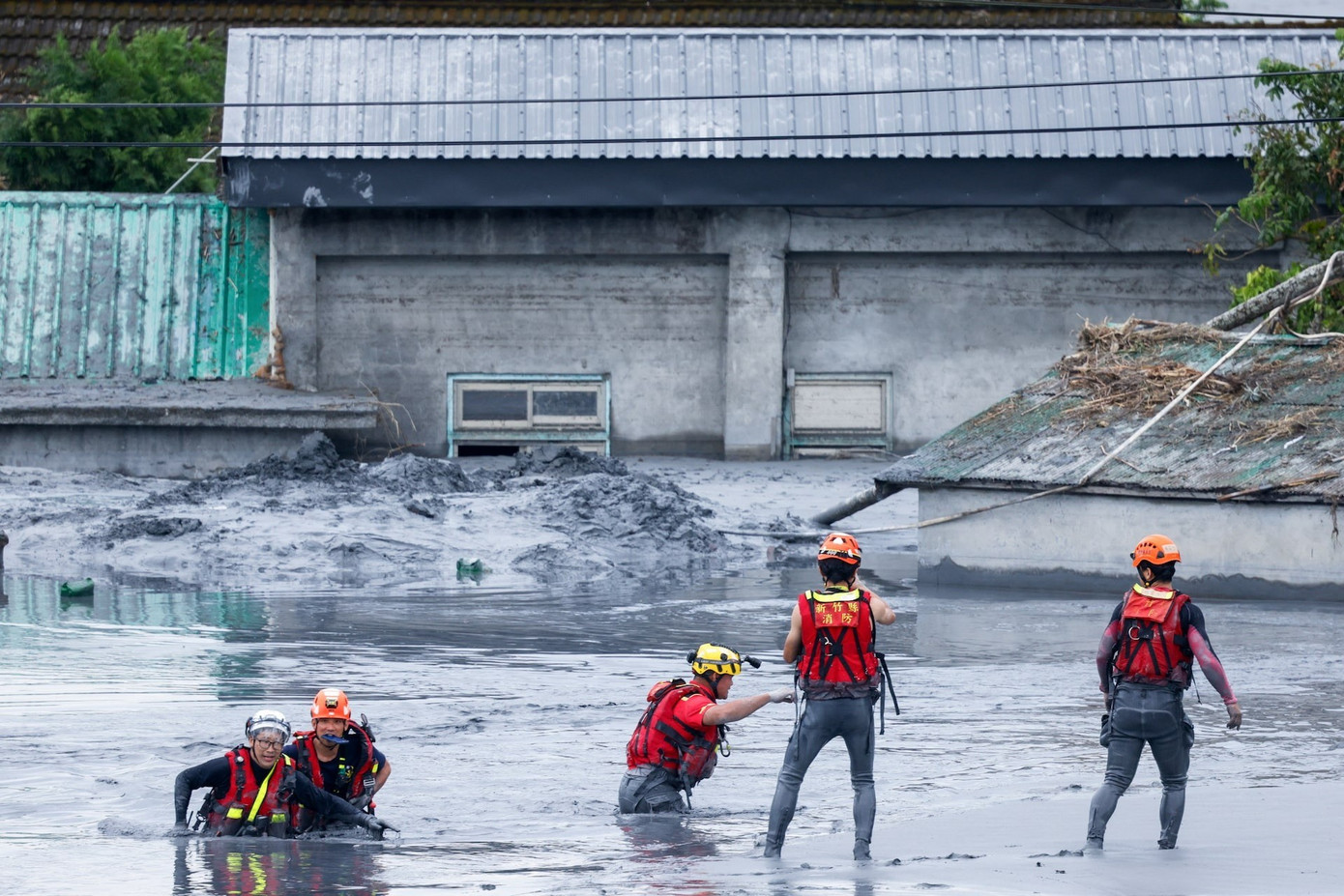 Đội cứu hộ lội dưới bùn sau đợt lũ lụt do siêu bão Ragasa gây ra ở Hoa Liên (Đài Loan, Trung Quốc) ngày 26/9. Hàng chục triệu người, từ Philippines đến Đài Loan, đã bị ảnh hưởng bởi siêu bão Ragasa. Tại Đài Loan, cơn bão đã khiến một hồ chắn bị vỡ, chôn vùi một số khu vực trong lớp bùn dày tới 4,8 m và khiến ít nhất 18 người thiệt mạng. (Ảnh: Reuters)