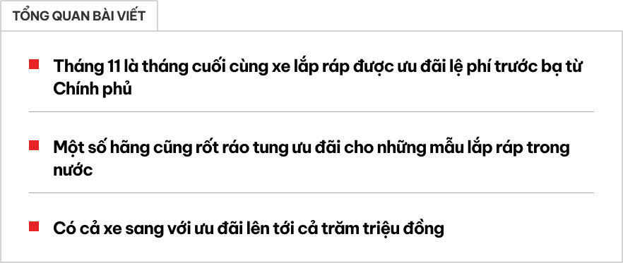 Theo Nghị định 109, các dòng xe sản xuất lắp ráp trong nước được giảm 50% lệ phí trước bạ khi đi đăng ký trong 3 tháng. Thời hạn kết thúc là 30/11/2024. Các hãng đang tận dụng nốt tháng cuối cùng xe lắp ráp có ưu thế trước xe nhập khẩu này để đưa ra những chương trình ưu đãi "nhẹ" nhưng giá trị lớn khi cộng dồn. Sau đó, kể từ tháng 12/2024, nếu muốn đấu xe nhập khẩu khá được ưa chuộng, xe lắp ráp cần có chính sách ưu đãi lớn từ hãng, chẳng hạn tương đương 100% lệ phí trước bạ.