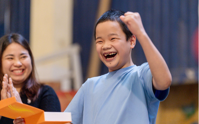 Hơn 120 hộp quà được gói giấy rực rỡ, buộc nơ lấp lánh, đính kèm những chiếc thiệp viết thư tay, đã hồi đáp chính xác những ước mơ ngây thơ của các em. Khi bé Tạ Viết Trường (6 tuổi) – cậu bé khiếm khuyết trí tuệ – được gọi tên đầu tiên, em bước lên sân khấu chậm rãi, mắt long lanh nhìn hộp quà. Chiếc đồng hồ đồ chơi, điện thoại nhựa và chú vịt bông hiện ra khiến em reo vui, ôm chặt vào lòng. Nụ cười giòn tan của Trường lan tỏa, kéo theo tiếng vỗ tay rần rần từ các bạn.
