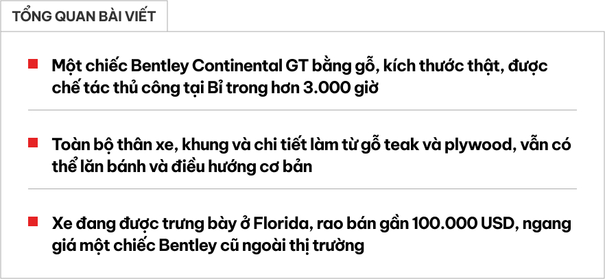 Thay vì bỏ ra vài chục ngàn USD để sở hữu một chiếc Bentley Continental GT đã qua sử dụng, một lựa chọn kỳ lạ vừa xuất hiện khiến cộng đồng mê xe ngạc nhiên: một chiếc Bentley làm hoàn toàn bằng gỗ, đủ kích thước như xe thật và được chế tác thủ công tại Bỉ.