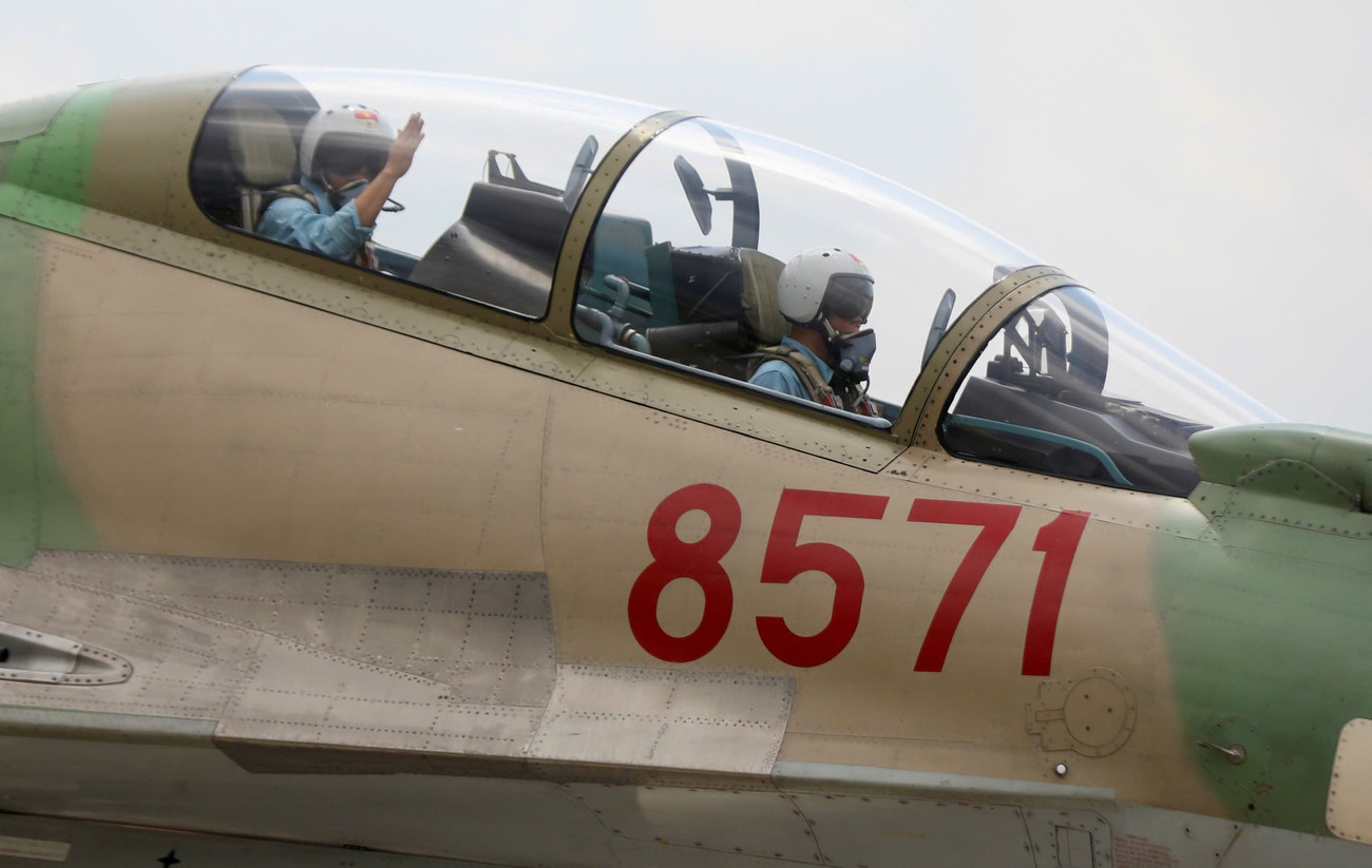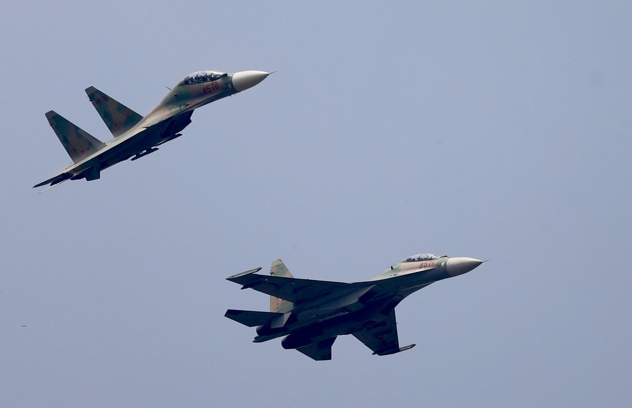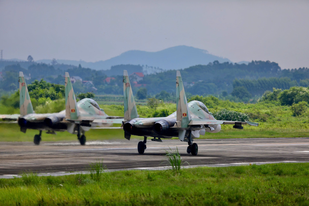 Hai chiếc Su-30MK2 của Không quân nhân dân Việt Nam rời đường băng cất cánh lên bầu trời. Được trang bị hai động cơ phản lực nên dù có trọng lượng lớn, Su-30MK2 vẫn có thể thực hiện nhiều thao tác bay phức tạp.