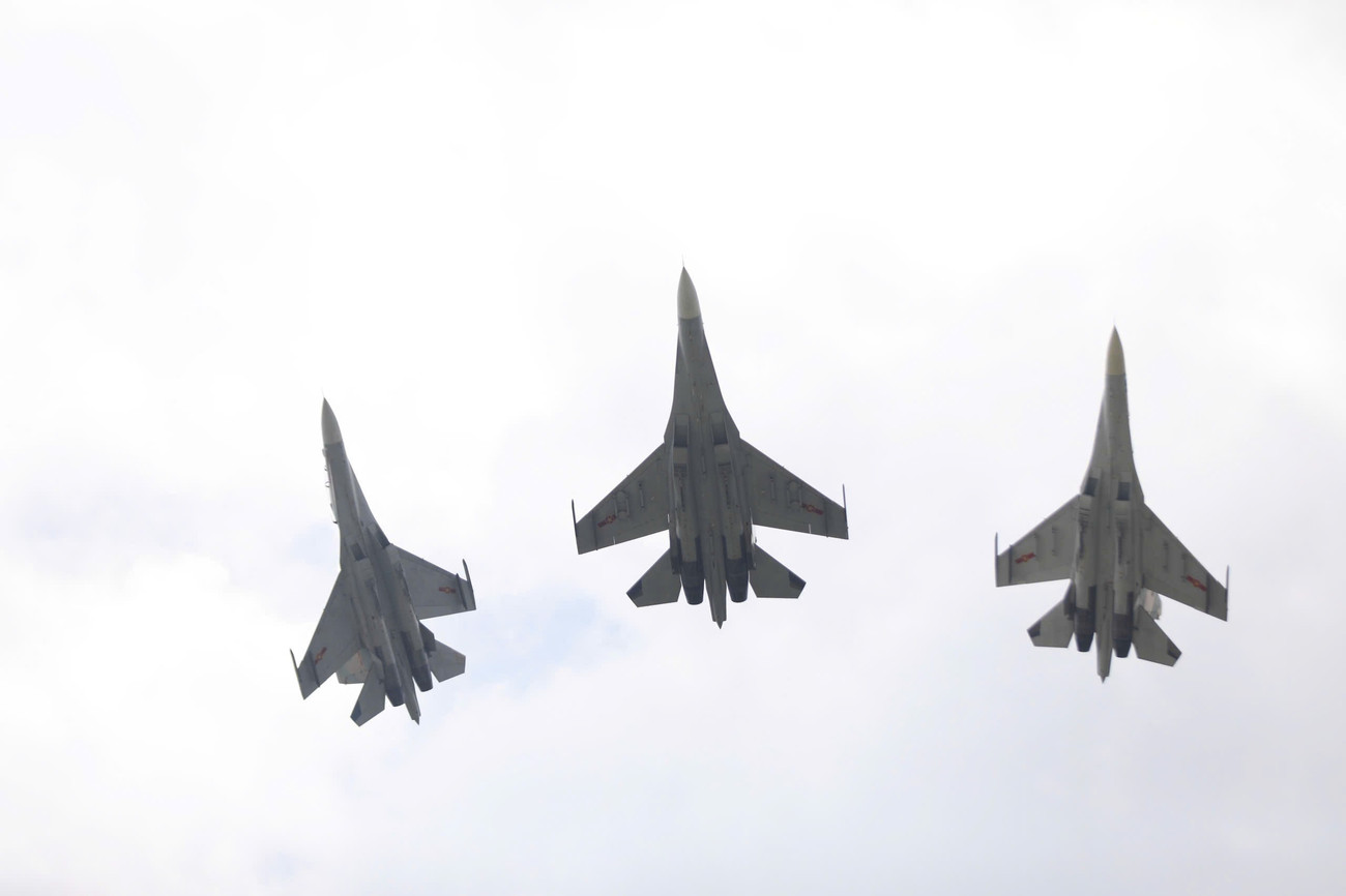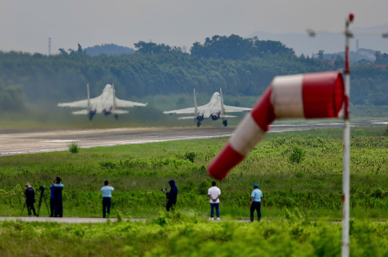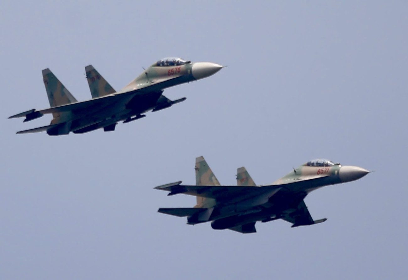 Hai chiếc Su-30MK2 của Không quân nhân dân Việt Nam rời đường băng cất cánh lên bầu trời. Được trang bị hai động cơ phản lực nên dù có trọng lượng lớn, Su-30MK2 vẫn có thể thực hiện nhiều thao tác bay phức tạp.