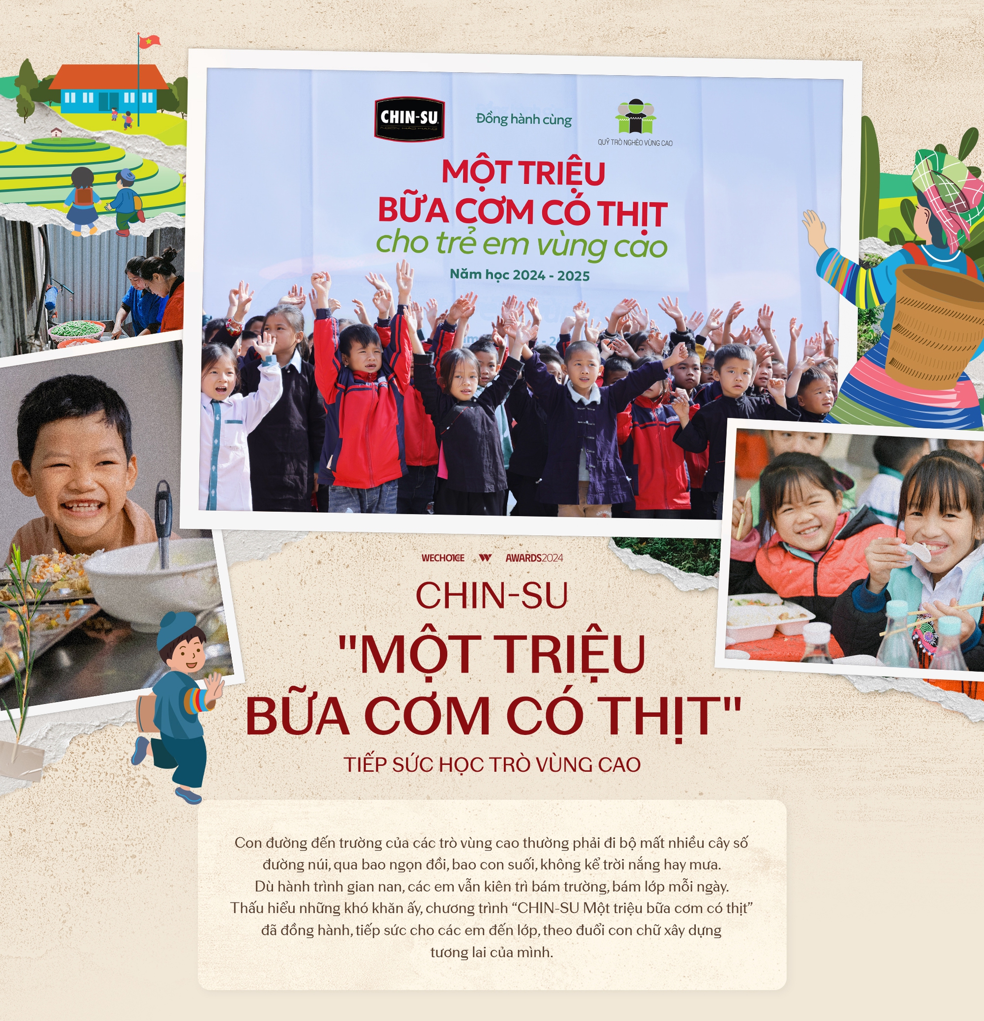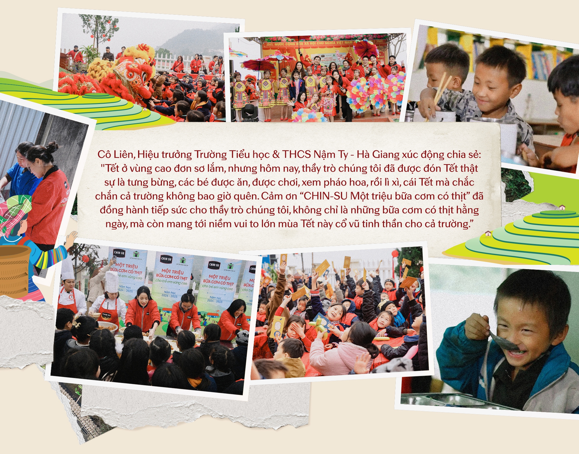 Mới đây nhất, dự án “CHIN-SU Một triệu bữa cơm có thịt” đã mang Tết sớm lên vùng cao, tạo nên một dịp Tết vui tưng bừng và đáng nhớ hơn bao giờ hết cho các em học sinh tại Trường Tiểu học & THCS Nậm Ty, huyện Hoàng Su Phì, tỉnh Hà Giang. Cùng với sự tham gia của ca sĩ Chi Pu, một tình nguyện viên đặc biệt, các em học sinh được trải nghiệm một ngày Tết rộn ràng và tràn đầy hứng khởi, từ việc trang trí hoa đào, câu đối, múa lân, nhảy sạp, đến nhận lì xì, cùng nhau ngắm pháo hoa và thưởng thức bữa cơm Tết thơm lừng, nóng hỏi & đủ đầy dinh dưỡng từ chiếc “chảo thịt kho trứng khổng lồ” được nấu bởi các nghệ nhân đầu bếp chuyên nghiệp.