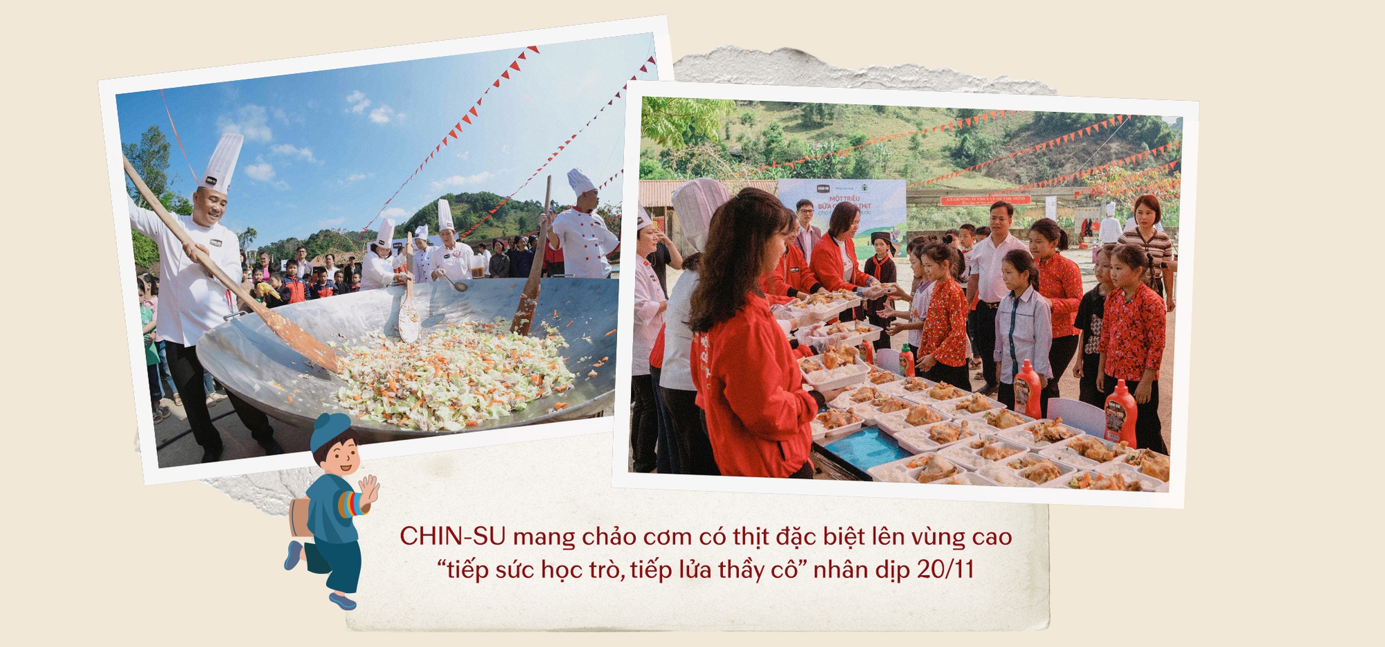 Bên cạnh những bữa cơm đủ đầy dinh dưỡng hằng tại trường, trong các dịp đặc biệt như lễ tri ân tết thầy cô 20/11 đến dịp đầu năm mới, “CHIN-SU Một triệu bữa cơm có thịt” còn phối hợp cùng các nghệ nhân đầu bếp chuyên nghiệp đem “chảo cơm có thịt khổng lồ” lên vùng cao nấu những bữa cơm có thịt ngon lành, góp phần lan tỏa niềm vui và tạo nên ký ức đẹp cho các em nhỏ.