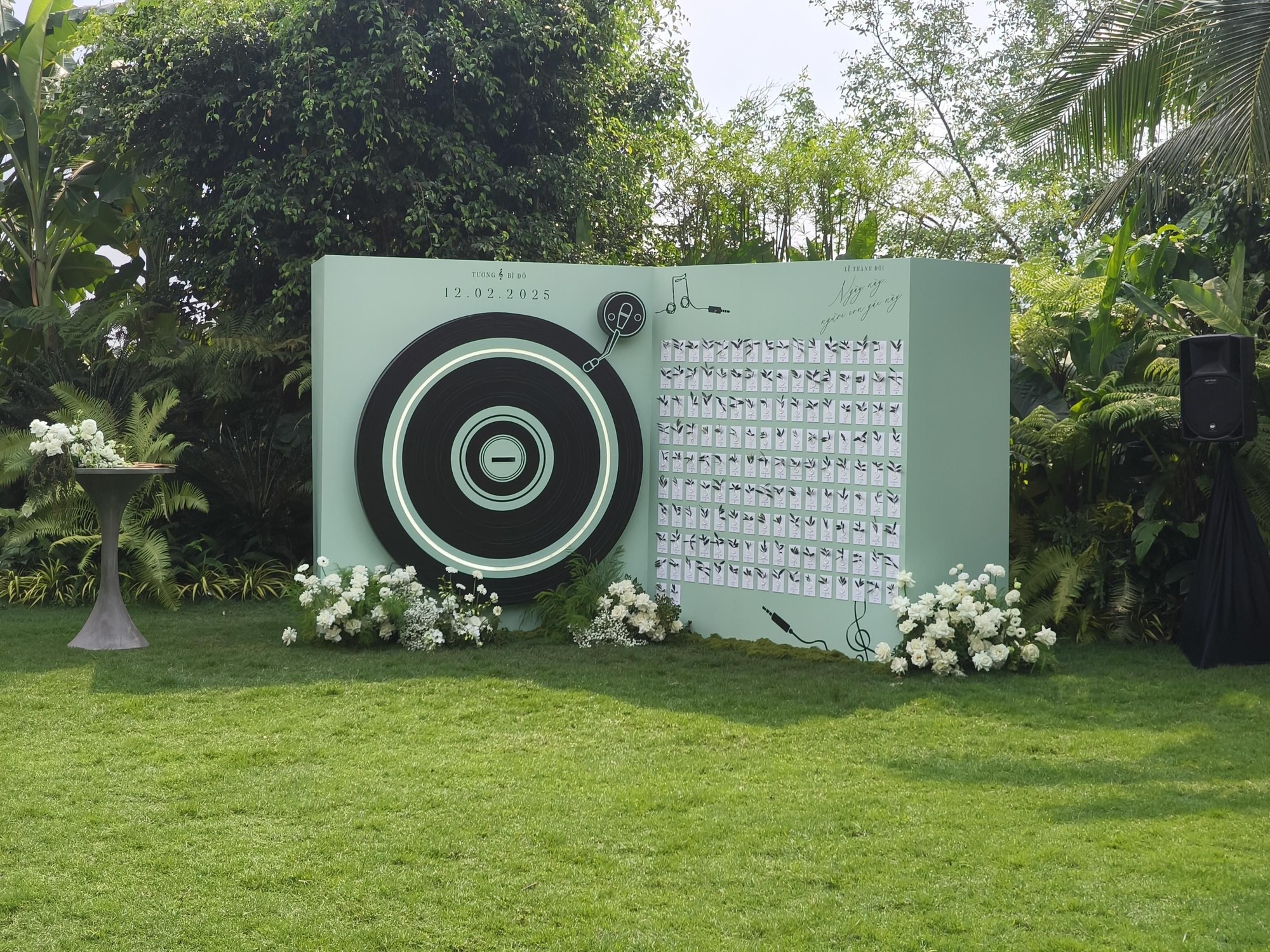 Bên cạnh đó, bàn tiệc cũng được trang trí theo concept này khi sử dụng những chiếc đĩa ăn có thiết kế mô phỏng đĩa nhạc, tạo cảm giác như khách mời đang thực sự hòa vào không gian âm nhạc. Từng vật phẩm nhỏ như thiệp, menu hay quà tặng đều được thiết kế theo tone pastel nhẹ nhàng, sang trọng nhưng vẫn đầy ấm cúng.