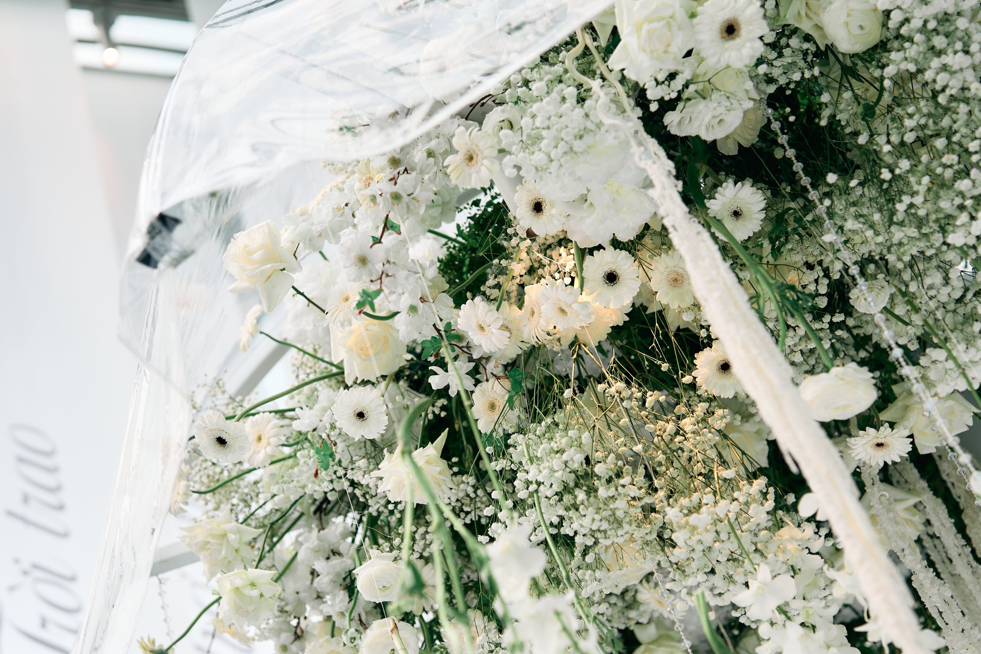 Cặp đôi sử dụng hoa tươi với màu trắng làm chủ đạo, tạo nên không gian lãng mạn, sang trọng mà ấm áp