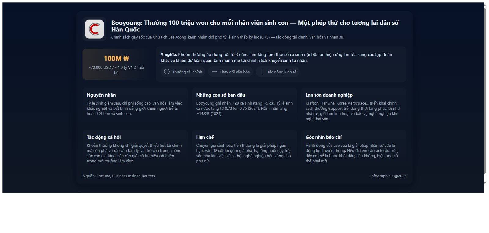 Chính sách của Booyoung vì vậy vừa là một phép thử, vừa là lời cảnh tỉnh. Nếu nó có thể kích hoạt một sự thay đổi văn hóa từ chỗ xem con cái là gánh nặng sang nhìn nhận chúng như nền tảng của tương lai thì phần thưởng 100 triệu won có thể được nhớ đến không chỉ như một khoản tiền, mà còn như cột mốc đánh dấu cho bước ngoặt trong câu chuyện dân số Hàn Quốc.