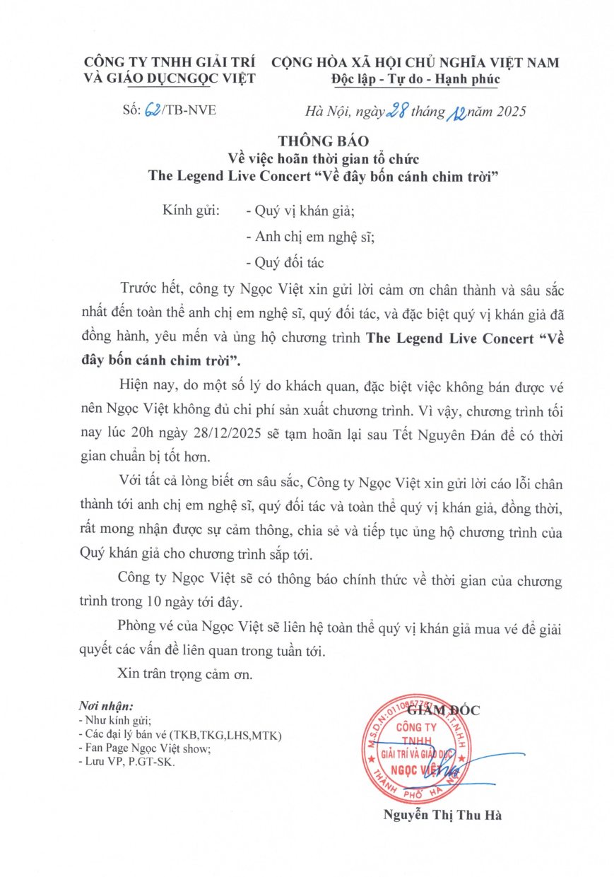 Sau khi đại diện ban tổ chức trực tiếp thông báo và xin lỗi khán giả tại hiện trường, đơn vị tổ chức là Ngọc Việt Show mới đăng tải thông báo chính thức trên fanpage, xác nhận việc hoãn The Legend Live Concert Về đây bốn cánh chim trời với lý do “bất khả kháng”. Ban tổ chức cho biết sẽ thông báo thời gian tổ chức mới trong vòng 10 ngày, đồng thời phòng vé sẽ liên hệ với khán giả đã mua vé để giải quyết các vấn đề liên quan trong tuần kế tiếp.