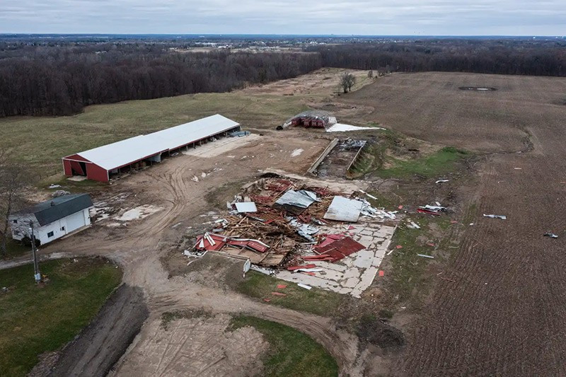 Một cơn lốc xoáy khẩn cấp, cảnh báo cao nhất của cơ quan thời tiết, đã được ban bố trong thời gian ngắn xung quanh Blytheville, Arkansas tối 2/4. Các mảnh vỡ bay lên cao ít nhất 7,6 km, theo nhà khí tượng học Chelly Amin