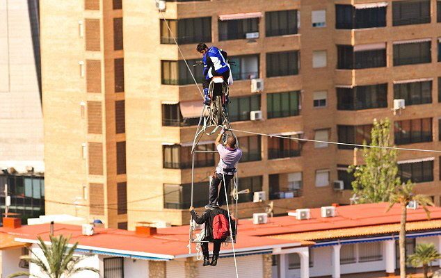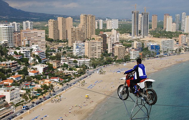 Nghệ sĩ lái mô tô nổi tiếng thế giới Mustafa Danger đã cố gắng thể hiện màn trình diễn đi mô tô trên dây ở độ cao 186m. Mustafa lái xe qua một sợi dây được căng từ tầng 43 của khách sạn La Cala de Tossal và Gran Hotel Bali ở Benidorm, Tây Ban Nha. Anh không hề dùng bất cứ thiết bị an toàn nào. Mặc dù rất cố gắng thực hiện màn trình diễn nhưng Mustafa đã bị thất bại trong lần thử đầu tiên và "mắc kẹt" lơ lửng trên dây trong khi chờ cứu hộ đến giải cứu. Trong lần thứ hai, anh đã thành công.