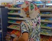 Chiếc mũ độc đáo với rất nhiều con bướm đậu xung quanh.