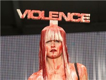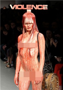 Thế nhưng, điều làm người xem cũng như giới thời trang và công chúng sốc hơn cả là Charlie Le Mindu đã nhuộm máu lên rất nhiều thiết kế. Đỉnh điểm của sự kinh hoàng là một người mẫu khỏa thân hoàn toàn, được đổ máu tươi động vật từ trên đỉnh đầu xuống tận gót chân.