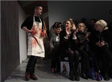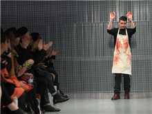Sự xuất hiện của Charlie Le Mindu cũng không kém phần "long trọng". Nhà thiết kế 24 tuổi sắm vai người đồ tể với chiếc tạp dề màu kem vàđôi bàn tay bê bết máu tươi. Ngay sau khi phút giây này khép lại, những lời phản hồi nhiều chiều đã liên tiếp xuất hiện.