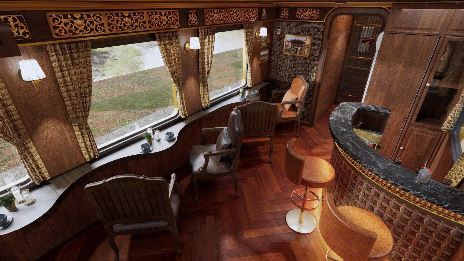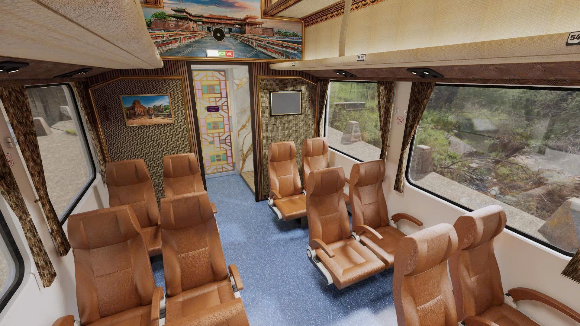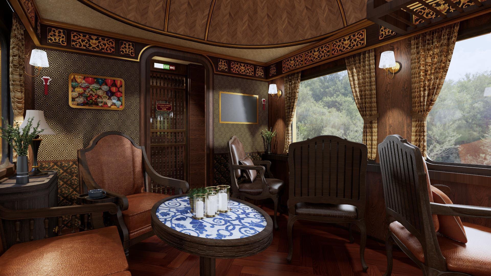 Điểm nhấn đặc biệt trong đoàn tàu đó là toa xe VIP (32 chỗ) được thiết kế với không gian hoài cổ, sang trọng của nội thất cung đình Huế. Điểm nhấn là bàn lượn dọc cửa sổ, nơi quý khách có thể nhâm nhi ly cà phê, thưởng thức âm nhạc trực tiếp và ngắm nhìn trọn vẹn vẻ đẹp đèo Hải Vân, vịnh Lăng Cô - vịnh đẹp top 1 thế giới.