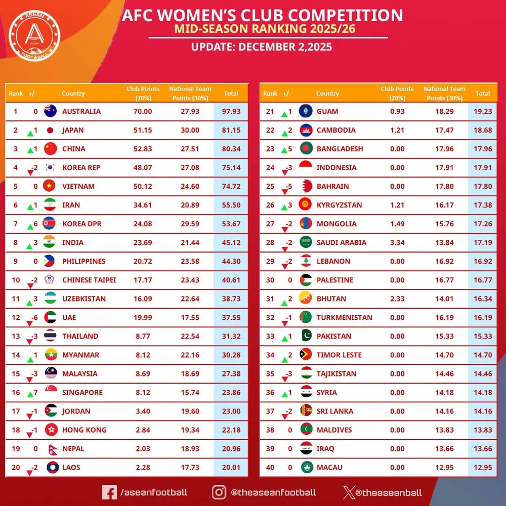 Australia tiếp tục giữ vững vị trí số 1 nhờ vào các màn trình diễn mạnh mẽ trong nước và sự ổn định của câu lạc bộ. Ở đấu trường AFC Women Champions League 2025-2026, CLB Melbourne City đã giành trọn 3 trận thắng để giành ngôi đầu bảng A đầy thuyết phục. Kết quả trên đã giúp Australia đạt 97.93 điểm, trong đó có 70 điểm từ thành tích của CLB.
