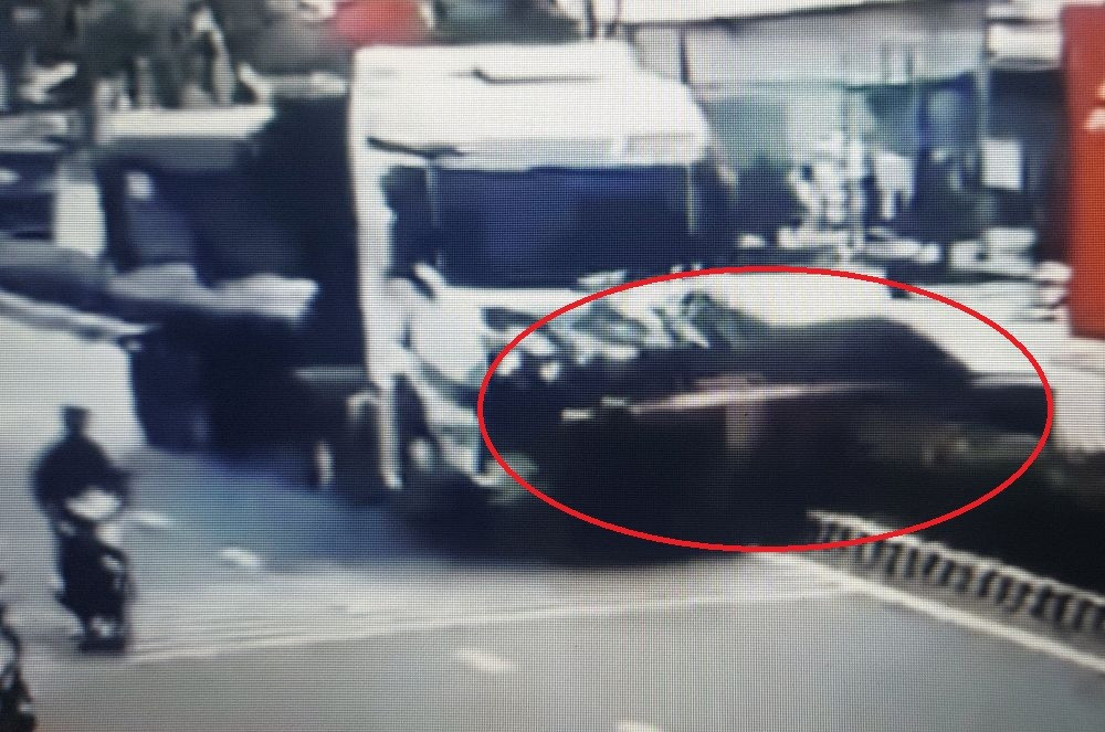 Sau khi tông trúng, xe ben lùa một đoạn trước khi hất văng ô tô bán tải sang bên kia đường
