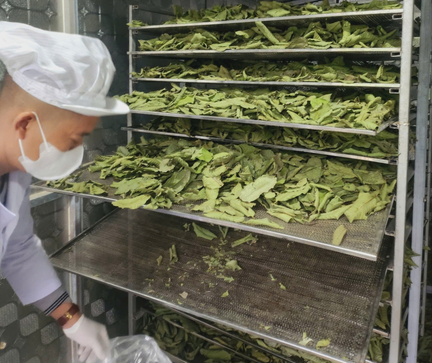 Từ những lá ổi nguyên liệu, công nhân sẽ phân loại, rửa sạch rồi trải lên khay và đưa vào máy sấy lạnh trong 48 tiếng. Sau đó, lá được sao khô, nghiền nát và đóng vào túi lọc. Nhờ công nghệ sấy lạnh tách nước, trà lá ổi vẫn giữ nguyên dưỡng chất vốn có.