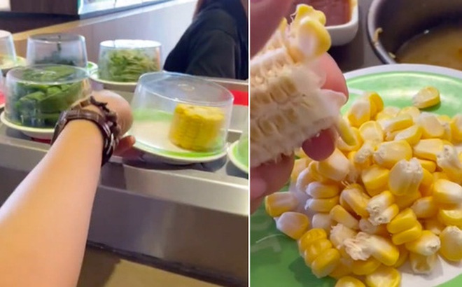 Cụ thể, đang ngồi ăn lẩu chưa được bao lâu thì cô gái này thấy no. Bỏ tiền ra nhiều nhưng ăn chưa được bao nhiêu, thời gian lại còn dư dả, thế là cô bạn quyết định lấy một phần bắp trên băng chuyền và bắt đầu ngồi… tách từng hạt.