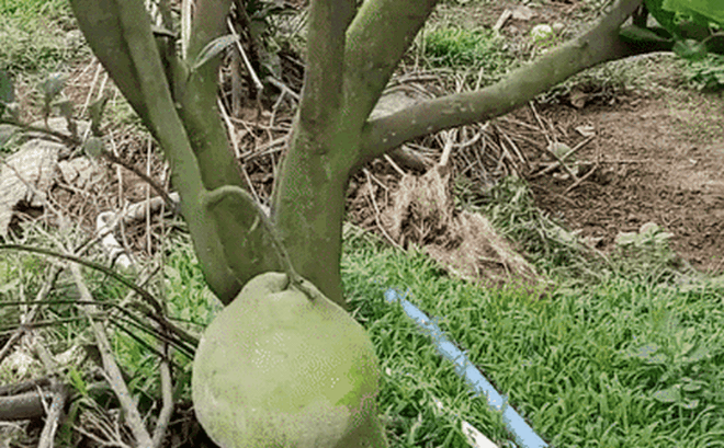 Quả bưởi mọc sát gốc, nhánh mỏng manh nhưng chờ mãi hơn nửa năm nay không chịu rụng