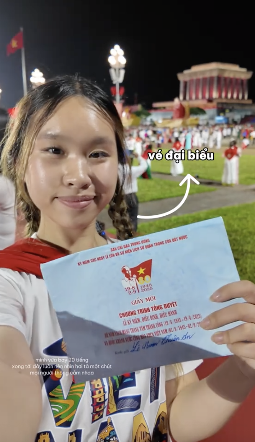 Theo đó, Vừng tiết lộ ngay sau khi biết tin mình có vé mời tham dự buổi lễ tổng duyệt, cô bạn đã xin phép nghỉ làm, đặt vé máy bay từ Mỹ trở về Việt Nam gấp. Vừng cũng bày tỏ trên trang cá nhân về vinh dự này: “Đi xem tổng duyệt diễu binh ở Lăng Bác là trải nghiệm xúc động nhất trong đời mình. Biết ơn và tự hào khi là người Việt Nam”.