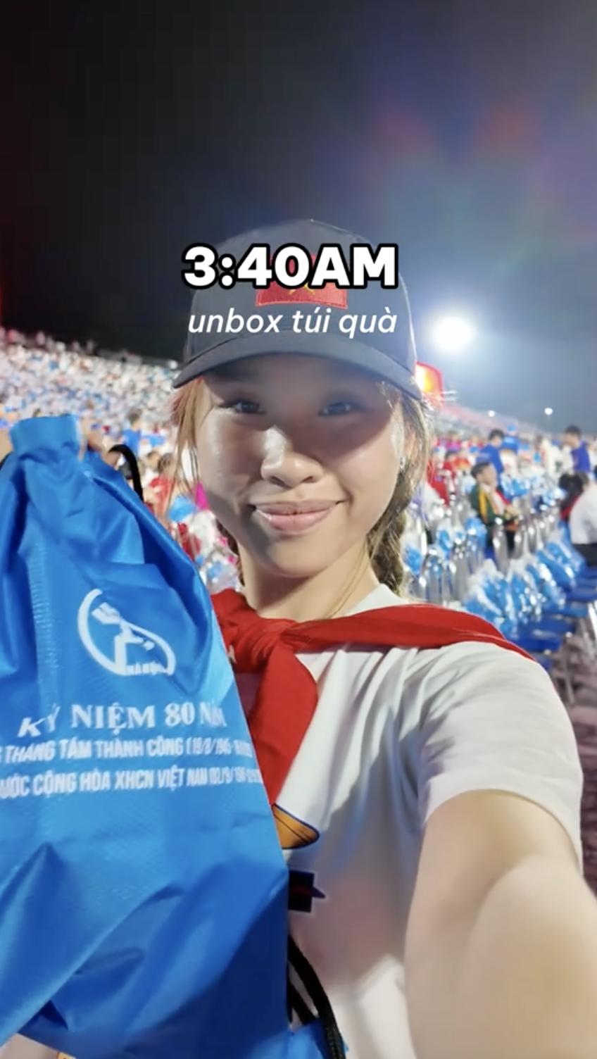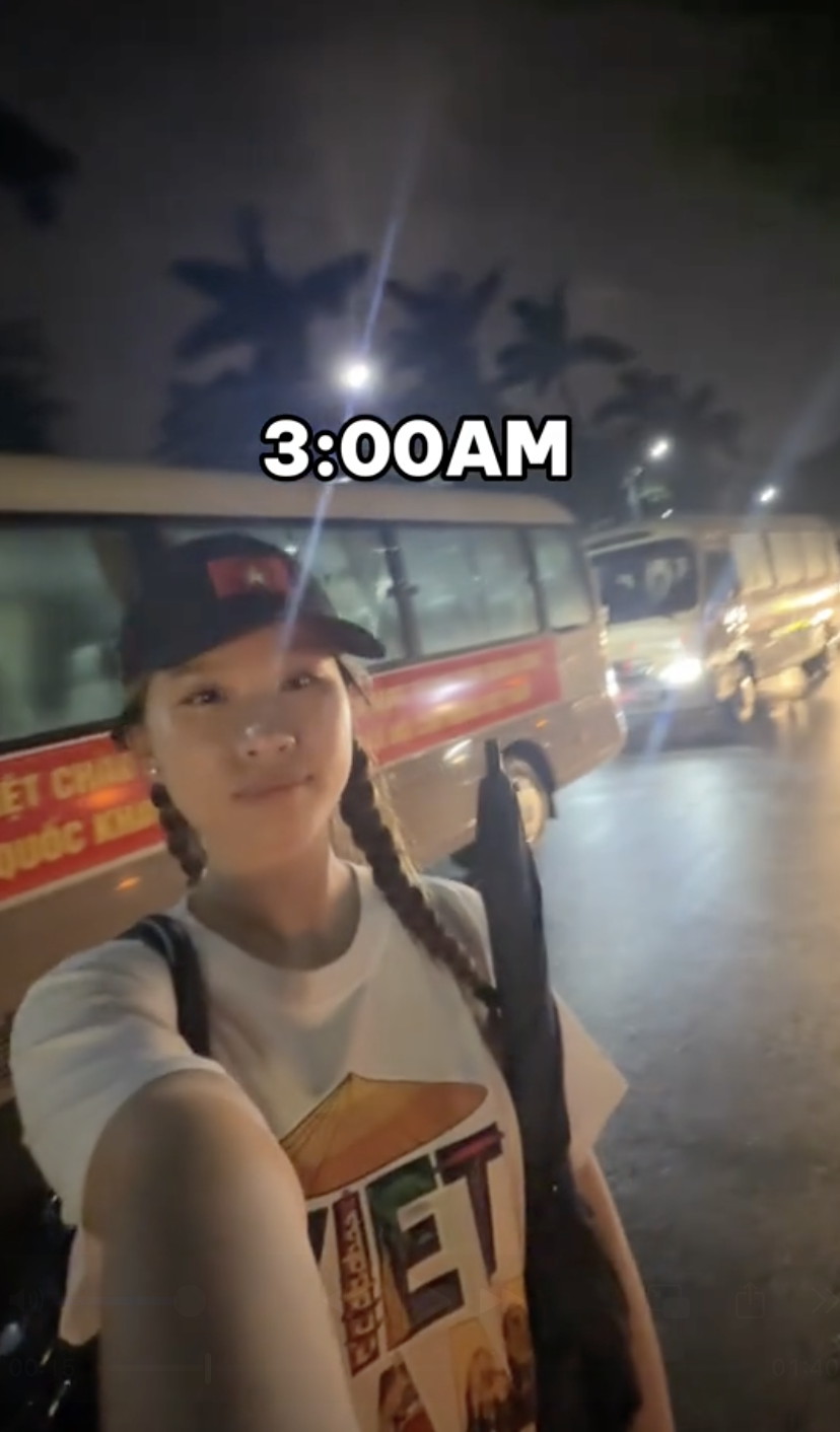 Trong video của mình, nữ YouTuber chia sẻ chi tiết về hành trình từ khi trời còn tờ mờ sáng. Khoảng 3h, cô bạn đã có mặt ở doanh trại quân đội để cùng lên xe cùng các cô chú bộ đội, đến Quảng trường Ba Đình. Tới địa điểm, toàn bộ các đại biểu sẽ đều phải kiểm tra an ninh sau đó tìm theo đúng số ghế đã được in trên thiệp mời để ổn định chỗ ngồi.