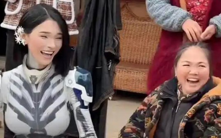 Đoạn video đang vô cùng viral trên mạng xã hội Trung Quốc cho thấy cô gái mặc bộ trang phục robot màu bạc, mang đậm chất tương lai. Cô nàng sải bước trên đôi giày cao gót, kéo vali về nhà với những cử chỉ cứng nhắc, máy móc. Hình ảnh "người máy" di chuyển giữa làng quê khiến ai nấy đều ngạc nhiên và thích thú. Sự chân thực trong tạo hình và diễn xuất của cô gái khiến nhiều người dân trong làng không khỏi thắc mắc liệu đây có phải là robot thật. Nhiều bà thím còn tiến đến gần, chạm vào "cô nàng robot" và bàn tán xôn xao. Cũng có người hoảng sợ vì cảnh tượng lạ này và không dám lại gần.