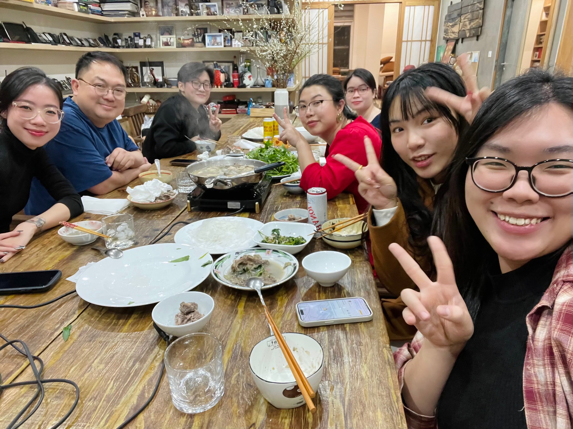 Hôm ấy, ông Tiến không chỉ cùng sinh viên sắp sách để chuẩn bị gửi tặng học sinh vùng cao, mà còn đích thân nấu lẩu vịt om sấu đãi cả nhóm. "Ngồi quanh nồi lẩu, thầy kể chuyện sách, chuyện sống, chuyện thời thanh niên của thầy. Không có khoảng cách nào cả. Thầy thật sự gần gũi và sẵn lòng chia sẻ những điều bổ ích tới chúng mình - những bạn sinh viên chỉ vừa mới quen".