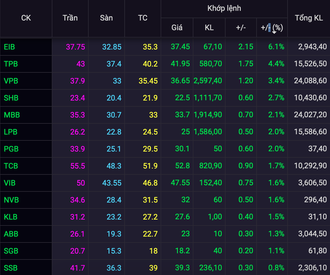 Các cổ phiếu tăng mạnh tiếp theo là TPB (4,4%), VPB (3,4%), SHB (2,7%), MBB (2,1%), LPB (2%),…