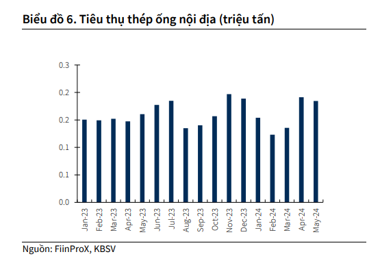 Tính tới thời điểm hiện tại, xu hướng hồi phục tại thị trường nội địa đã và đang diễn ra khi sản lượng tiêu thụ thép ống T4-05/2024 đạt 191/184 nghìn tấn, tăng 26%/14% so với cùng kỳ (90% sản lượng thép ống được tiêu thụ tới từ thị trường trong nước). KBSV kỳ vọng sản lượng tiêu thụ toàn ngành thép trong 2024/2025 tăng 15%/8% so với cùng kỳ.