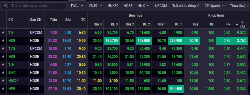 Giữa lúc thị trường giao dịch ảm đạm, nhóm cổ phiếu thép bất ngờ chứng kiến đà bứt phá ấn tượng ngay từ khi mở cửa. Dòng tiền ồ ạt chảy mạnh giúp các cổ phiếu tăng điểm nhanh chóng, trong đó nổi bật có thể kể tới TIS (+9,52%) áp sát giá trần, HSG (+4%), TVN (+4,4%), HPG (+2,4%), TLH và NKG cùng tăng khoảng 3% giá trị,…