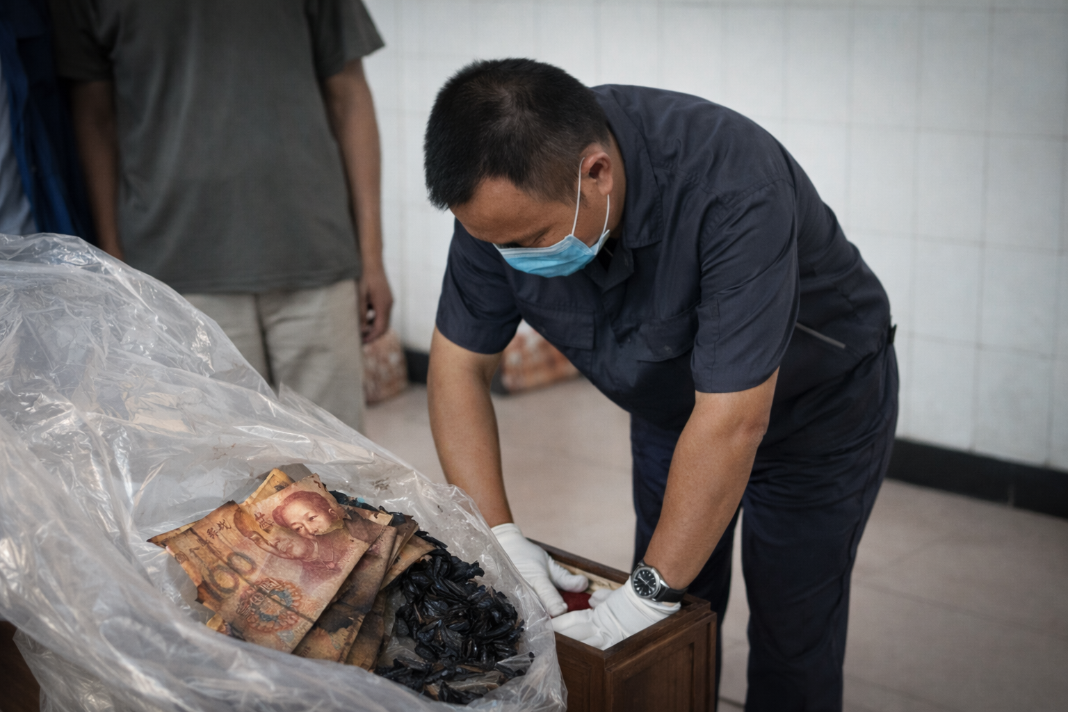 Khi các con ông đến nơi, thi thể ông đã được đưa đi hỏa táng. Trong quá trình hỏa táng, nhân viên phát hiện trên người ông có hàng trăm tờ tiền mệnh giá 100 NDT đã cháy xém. Sau đó, sổ tiết kiệm của ông được trao lại cho các con. Khi kiểm tra, họ bàng hoàng nhận ra ông từng có 210.000 NDT trong tài khoản, nhưng toàn bộ số tiền đã được rút ra trước đó, nghĩa là ông đã mang tất cả số tiền dành dụm cả đời vào lò hỏa táng cùng mình.