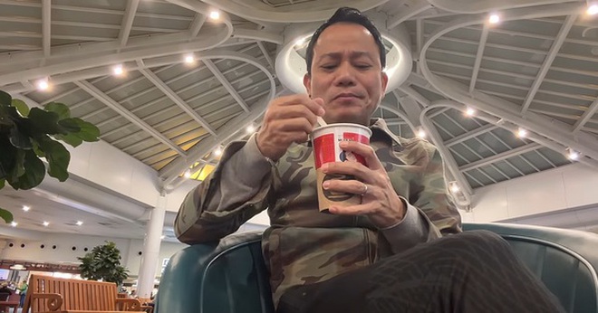 Hộp mì này tôi đem từ Việt Nam qua đây luôn, ăn ngon quá. Kinh nghiệm khi đi bay ở Mỹ là phải đem mì gói theo để ăn vì sáng sớm ở sân bay Mỹ toàn bán đồ Mỹ, ăn không nổi. Nếu có thêm tôm khô và lát chanh vắt vào nữa thì tuyệt vời. Ăn xong mì rồi tôi sẽ đi mua chai nước để uống thuốc".