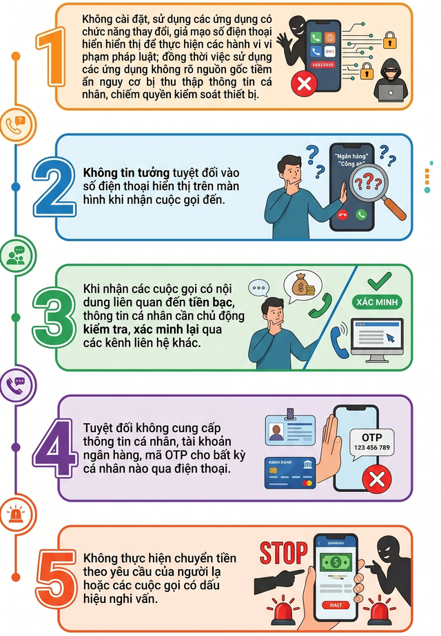 Điểm đáng lo ngại là việc giả mạo số điện thoại khiến người nhận cuộc gọi dễ tin tưởng do số hiển thị trùng với số quen biết. Điều này làm giảm cảnh giác, tạo điều kiện để các đối tượng dẫn dụ thực hiện các yêu cầu theo kịch bản lừa đảo đã chuẩn bị sẵn.